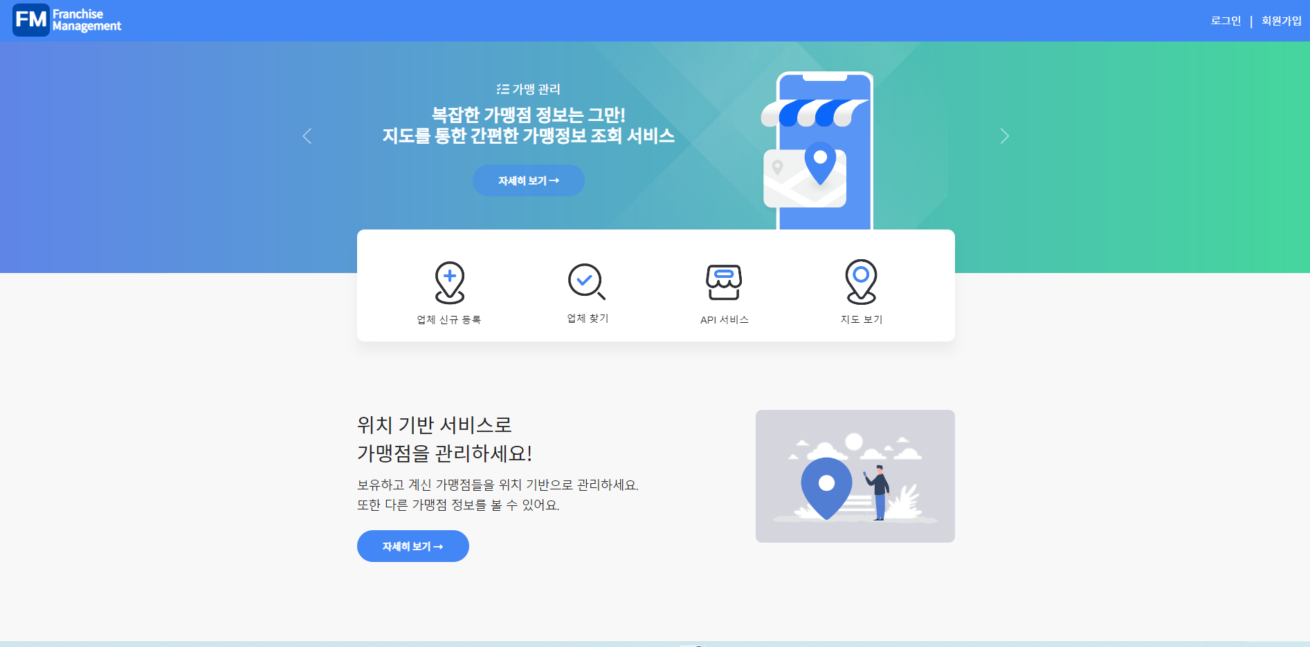 간단히 프로젝트를 설명하자면, 가맹점주가 가맹점 관련 정보를 해당 서비스에 등록하면 일반 사용자는 네이버 지도 API 를 기반으로 한 가맹점 정보 조회 서비스를 이용할 수 있다. 또한 가맹점 정보는 OPEN API 를 통해서 외부에 제공된다.