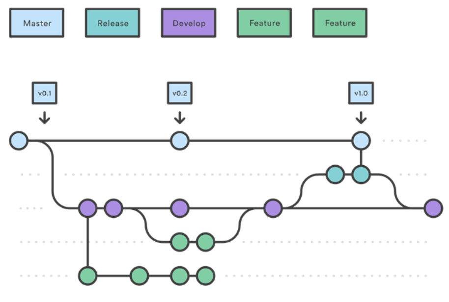 - 개발자는 develop 브랜치로부터 본인이 신규 개발할 기능을 위한 feature 브랜치를 생성한다.
